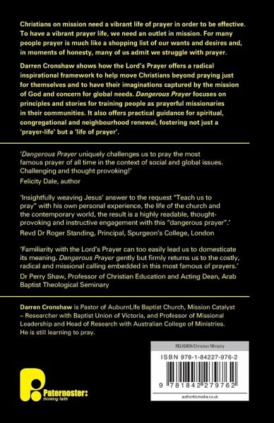 Dangerous Prayer offers a strategy for fostering prayer and spirituality in mission that focuses on neighbourhood transformation and global needs using the Lord's Prayer as a radical blueprint. Sustainability in mission is not possible without prayer; vibrancy in prayer is not possible without mission. Christians on mission need a vibrant life of prayer in order to be effective yet to have a vibrant prayer life they need an outlet in mission. The Lord's Prayer offers a radical inspirational framework to help move Christians beyond praying just for themselves and to have their imaginations captured by the mission of God and concern for global needs. Jesus' words guide us to pray for God's Kingdom on earth, for restoration, for food for all who are hungry, for people to experience forgiveness and all that really is good news about Jesus. It is a dangerous prayer because of its counter-cultural and radical stance, and because it invites us to be, in part, the answer to our prayers. This book offers inspiring and practical approaches for unleashing the whole people of God for missional prayer and prayerful mission.