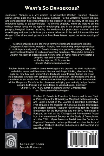 WHAT'S SO DANGEROUS? Dangerous Pursuits is a wry allusion to philosopher Stephen Braude’s obstacle-strewn career path over the past several decades—to the vindictive hostility, ridicule, and condescension he’s encountered for his decision to look carefully at the data and theoretical issues of parapsychology. The diverse chapters, which are incisive but not without humor, focus on the topic of mediumship, and in the process address major parapsychological themes, including the evidence for postmortem survival and the unsettling question of the limits of paranormal influence. In the end, it turns out the real danger is the widespread ignorance of how these issues impact our understanding of reality.