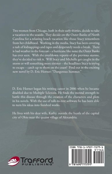 Two women from Chicago, both in their early thirties, decide to take a vacation to the seaside. They decide on the Outer Banks of North Carolina for a relaxing beach vacation like those Stacy remembers from her childhood. Working in the media, Stacy has been covering a rash of kidnappings and rapes and desperately needs a break. There is bad weather in the forecast - a hurricane like none the Outer Banks has ever seen. With the overblown reports of the previous storms, they've decided to risk it. Will Stacy and Michelle get caught in the storm or will something more sinister - the headlines Stacy is trying to escape - catch up to them on the coast? Find out in the exciting new novel by D. Eric Horner: "Dangerous Summer."