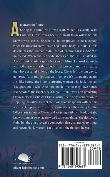 An uncertain future... Spring is a time for a fresh start, which is exactly what Coroner Olivia Jones needs. A small town where no one knows who she is. Except the future proves to be uncertain when the blizzard snow thaws and a dead body is found. Olivia determines the woman didn't die of natural causes. She was murdered. When another body shows up, the FBI is called in. Agent Hank Masters specializes in profiling. He works closely with Olivia when a third body is discovered and they realize they have a serial killer on the loose. Olivia left the big city to get away from murder and can't believe it's happening again. Just like before, the killer is targeting women who look like her. The question is why. And how much time do they have before she becomes the killer's next target. Hank insists on protecting Oliva himself as he can't risk losing their only connection to stopping the killer. Except the more time he spends with her, he realizes his protective instincts run deeper than the job. The killer starts taunting Olivia and messing with her head, but she knows running away again won't solve anything. She decides to fight, but the clues reveal a connection that changes everything, and Agent Hank Masters isn't the man she thought he was.