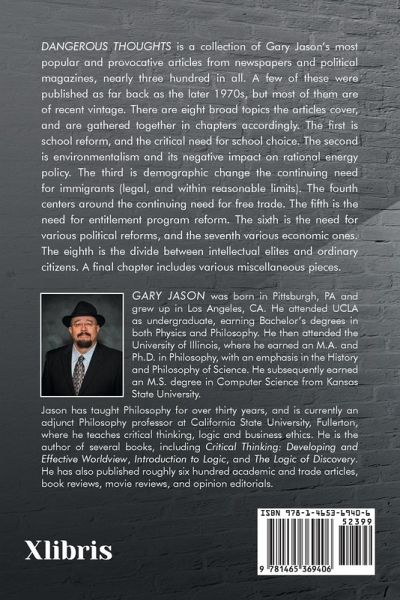Dangerous Thoughts is a collection of Gary Jason's most popular and provocative articles from newspapers and political magazines, nearly three hundred in all. A few of these were published as far back as the later 1970s, but most of them are of recent vintage. There are eight broad topics the articles cover, and are gathered together in chapters accordingly. The first is school reform, and the critical need for school choice. The second is environmentalism and its negative impact on rational energy policy. The third is demographic change the continuing need for immigrants (legal, and within reasonable limits). The fourth centers around the continuing need for free trade. The fifth is the need for entitlement program reform. The sixth is the need for various political reforms, and the seventh various economic ones. The eighth is the divide between intellectual elites and ordinary citizens. A final chapter includes various miscellaneous pieces.