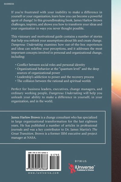If you're frustrated with your inability to make a difference in yourself or your organization, learn how you can become a powerful agent of change! In this groundbreaking book, James Harlow Brown challenges, inspires, and shows you how to transform your ideas and your organization in ways you never thought possible. This visionary and motivational guide contains a number of stories that help you rethink your assumptions about life and create change. Dangerous Undertaking examines how out-of-the-box experiences and ideas can redefine your perceptions, and it addresses the most important concepts involved in personal and organizational change, including: Conflict between social roles and personal identity Organizational behavior at the "quantum level" and the deep sources of organizational power Leadership's addiction to power and the recovery process The collision between the rational and spiritual worlds Perfect for business leaders, executives, change managers, and ordinary working people, Dangerous Undertaking will help you unleash your ability to make a difference in yourself, in your organization, and in the world.