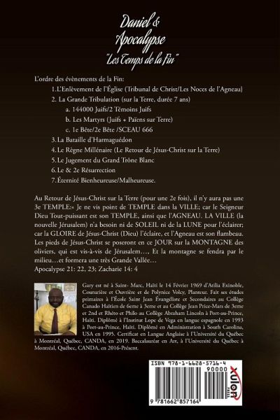 L'ordre des évènements de la Fin: 1.L'Enlèvement de l'Église (Tribunal de Christ/Les Noces de l'Agneau} 2. La Grande Tribulation (sur la Terre, durée 7 ans) a. 144000 Juifs/2 Témoins Juifs b. Les Martyrs (Juifs ] Païens sur Terre) c. 1e Bête/2e Bête /SCEAU 666 3. La Bataille d'Harmaguédon 4. Le Règne Millénaire (Le Retour de Jésus-Christ sur la Terre) 5. Le Jugement du Grand Trône Blanc 6. Le & 2e Résurrection 7. Éternité Bienheureuse/Malheureuse. Au Retour de Jésus-Christ sur la Terre (pour une 2e fois), il n'y aura pas une 3e TEMPLE: Je ne vis point de TEMPLE dans la VILLE; car le Seigneur Dieu Tout-puissant est son TEMPLE, ainsi que l'AGNEAU. LA VILLE (la nouvelle Jérusalem) n'a besoin ni de SOLEIL ni de la LUNE pour l'éclairer; car la GLOIRE de Jésus-Christ (Dieu) l'éclaire, et l'Agneau est son flambeau. Les pieds de Jésus-Christ se poseront en ce JOUR sur la MONTAGNE des oliviers, qui est vis-à-vis de Jérusalem..., Et la montagne se fendra par le milieu...et formera une très Grande Vallée... Apocalypse 21: 22, 23; Zacharie 14: 4 Gary est né à Saint- Marc, Haïti le 14 Février 1969 d'Atilia Exinoble, Couturière et Ouvrière et de Polynice Volcy, Planteur. Fait ses études primaires à l'École Saint Jean Évangéliste et Secondaires au Collège Canado Haïtien de 6eme à 3eme et au Collège Jean Price-Mars de 3eme et 2nd et Rhéto et Philo au Collège Abraham Lincoln à Port-au-Prince, Haïti. Diplômé à l'Institut Lope de Vega en langue espagnole en 1993 à Port-au-Prince, Haïti. Diplômé en Administration à South Carolina, USA en 1995. Certificat en Langue Anglaise à l'Université du Québec à Montréal, Québec, CANDA, en 2019. Baccalauréat en Art, à l'Université du Québec à Montréal, Québec, CANDA, en 2016-Présent.