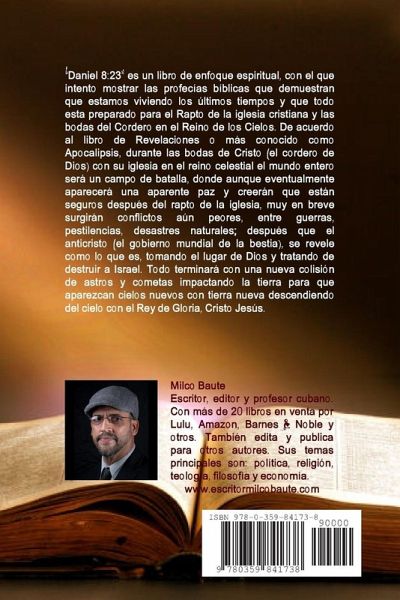 ?Daniel 8:23? es un libro de enfoque espiritual, con el que intento mostrar las profec?as b?blicas que demuestran que estamos viviendo los ?ltimos tiempos y que todo esta preparado para el Rapto de la iglesia cristiana y las bodas del Cordero en el Reino de los Cielos. De acuerdo al libro de Revelaciones o m?s conocido como Apocalipsis, durante las bodas de Cristo (el cordero de Dios) con su iglesia en el reino celestial el mundo entero ser? un campo de batalla, donde aunque eventualmente aparecer? una aparente paz y creer?n que est?n seguros despu?s del rapto de la iglesia, muy en breve surgir?n conflictos a?n peores, entre guerras, pestilencias, desastres naturales; despu?s que el anticristo (el gobierno mundial de la bestia), se revele como lo que es, tomando el lugar de Dios y tratando de destruir a Israel. Todo terminar? con una nueva colisi?n de astros y cometas impactando la tierra para que aparezcan cielos nuevos con tierra nueva descendiendo del cielo con el Rey de Gloria, Cristo Jes?s.