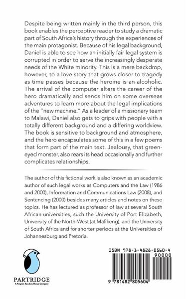 Despite being written mainly in the third person, this book enables the perceptive reader to study a dramatic part of South Africa's history through the experiences of the main protagonist. Because of his legal background, Daniel is able to see how an initially fair legal system is corrupted in order to serve the increasingly desperate needs of the White minority. This is a mere backdrop, however, to a love story that grows closer to tragedy as time passes because the heroine is an alcoholic. The arrival of the computer alters the career of the hero dramatically and sends him on some overseas adventures to learn more about the legal implications of the "new machine." As a leader of a missionary team to Malawi, Daniel also gets to grips with people with a totally different background and a differing worldview. The book is sensitive to background and atmosphere, and the hero encapsulates some of this in a few poems that form part of the main text. Jealousy, that green-eyed monster, also rears its head occasionally and further complicates relationships.