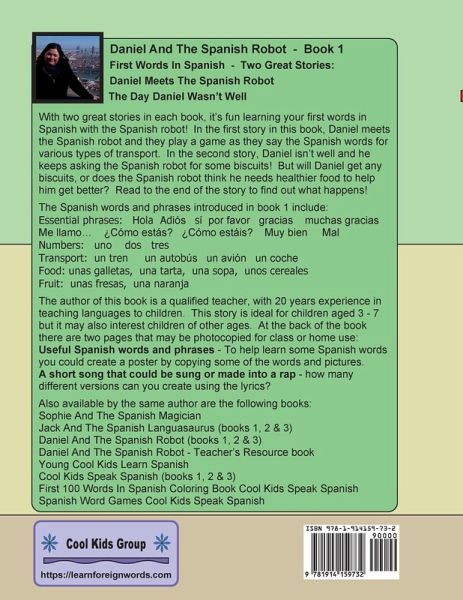 With two great stories in each book, it's fun learning your first words in Spanish with the Spanish robot! In the first story in this book, Daniel meets the Spanish robot and they play a game as they say the Spanish words for various types of transport. In the second story, Daniel isn't well and he keeps asking the Spanish robot for some biscuits! But will Daniel get any biscuits, or does the Spanish robot think he needs healthier food to help him get better? Read to the end of the story to find out what happens! The Spanish words and phrases introduced in book 1 include:Essential phrases: Hola, Adiós, sí, por favor, gracias, muchas gracias Me llamo... ¿Cómo estás? ¿Cómo estáis? Muy bien / Mal Numbers: uno dos tres Transport: un tren, un autobús, un avión, un coche Food: unas galletas, una tarta, una sopa, unos cereales Fruit: unas fresas, una naranja The author of this book is a qualified teacher, with 20 years experience in teaching languages to children. This story is ideal for children aged 3 - 7 but it may also interest children of other ages. At the back of the book there are two pages that may be photocopied for class or home use:Useful Spanish words and phrases - To help learn some Spanish words you could create a poster by copying some of the words and pictures. A short song that could be sung or made into a rap - how many different versions can you create using the lyrics? ¿Also available by the same author are the following books:Sophie And The Spanish Magician Jack And The Spanish Languasaurus (books 1, 2 & 3) Daniel And The Spanish Robot (books 1, 2 & 3) Daniel And The Spanish Robot - Teacher's Resource book Young Cool Kids Learn Spanish Cool Kids Speak Spanish (books 1, 2 & 3) First 100 Words In Spanish Coloring Book Cool Kids Speak Spanish Spanish Word Games Cool Kids Speak Spanish