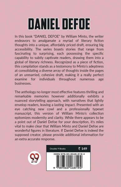 In this book "DANIEL DEFOE" by William Minto, the writer endeavors to amalgamate a myriad of literary fiction thoughts into a unique, affordably priced draft, ensuring big accessibility. The series boasts stories that range from fascinating to surprising, each possessing the specific capability to subtly captivate readers, drawing them into a global of literary richness. Recognized as a piece of fiction, this compilation stands as a testomony to Minto's adeptness at consolidating a diverse array of thoughts inside the pages of an unmarried, cohesive draft, making it a really perfect examine for individuals throughout numerous age businesses. The anthology no longer most effective features thrilling and remarkable memories however additionally exhibits a nuanced storytelling approach, with narratives that lightly envelop readers, leaving a lasting impact. Presented with an eye catching new cowl and a professionally typeset manuscript, this version of William Minto's collection epitomizes modernity and clarity. While there appears to be a point out of Daniel Defoe for your description, it's miles vital to make clear that William Minto and Daniel Defoe are wonderful figures in literature. If Daniel Defoe is indeed the supposed creator, please provide additional information for an extra accurate response.