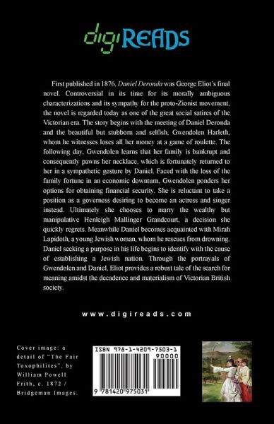 First published in 1876, "Daniel Deronda" was George Eliot's final novel. Controversial in its time for its morally ambiguous characterizations and its sympathy for the proto-Zionist movement, the novel is regarded today as one of the great social satires of the Victorian era. The story begins with the meeting of Daniel Deronda and the beautiful but stubborn and selfish, Gwendolen Harleth, whom he witnesses loses all her money at a game of roulette. The following day, Gwendolen learns that her family is bankrupt and consequently pawns her necklace, which is fortunately returned to her in a sympathetic gesture by Daniel. Faced with the loss of the family fortune in an economic downturn, Gwendolen ponders her options for obtaining financial security. She is reluctant to take a position as a governess desiring to become an actress and singer instead. Ultimately she chooses to marry the wealthy but manipulative Henleigh Mallinger Grandcourt, a decision she quickly regrets. Meanwhile Daniel becomes acquainted with Mirah Lapidoth, a young Jewish woman, whom he rescues from drowning. Daniel seeking a purpose in his life begins to identify with the cause of establishing a Jewish nation. Through the portrayals of Gwendolen and Daniel, Eliot provides a robust tale of the search for meaning amidst the decadence and materialism of Victorian British society. This edition is printed on premium acid-free paper.