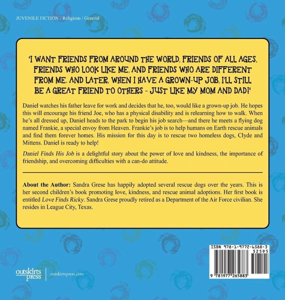 WE ARE ALL DIFFERENT AND AWESOME IN OUR OWN WAY! BE HAPPY TO BE YOU! This is a delightful story about Daniel's search for his grown-up job. Daniel wants to be just like his mom and dad. He hopes his job will also help him encourage his friend Joe who has a physical disability and is in a wheelchair. As he thinks about the perfect job, Daniel encounters two homeless dogs, Clyde and Mittens. Clyde is injured because he tries to protect Mittens from dogs who constantly bully her by making fun of her four white paws. Daniel unexpectedly gets assistance from Frankie, a superpower dog from Heaven. Frankie's job in Heaven is to help humans on Earth rescue animals and find them forever homes. Daniel and Frankie rescue Clyde and Mittens while also encouraging Joe to walk. In reading this book, parents and children alike will observe how the power of love and kindness, embodied in friendship, helps Daniel, Joe, Clyde, and Mittens overcome difficulties. This tender story contains examples to help children understand the importance of not giving up, facing challenges, having pride, and believing in yourself. It shows favorable results in many ways. Joe and Clyde meet physical challenges by having a positive attitude. Mittens' paws "save the day" by helping Clyde when he is injured, and Mittens soon realizes that she is awesome, just as she is. Daniel learns the impact of friendship. Frankie returns to Heaven, having helped two boys find joy and two little dogs find a forever home. This book also demonstrates the seriousness of bullying and the emotional pain it causes. Most importantly, it advises all of us: DON'T BE A BULLY. BE A FRIEND!