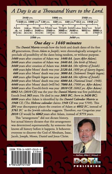 The Daniel Calendar Matrix was developed by author Allen C. Stroud in 2006. A limited release of the work was made public in 2010. It was subsequently released world-wide in 2014. With its focus on the genealogical record in Genesis, the Daniel Matrix reveals how the birth and death dates of twenty-three specific Hebrew Patriarchs, from Adam to Joseph, were chronologically arranged to preclude all possibility of the numbers and dates being random, fictional or without purpose. According to this research, a "contiguous" period of 2,309 years was recorded in Genesis by Moses after the Exodus of 1532 BC, and before his death in 1492 BC. The author's goal was to accurately align that unique 2,309 year period in history to the Gregorian calendar, thus connecting it to modern history. This research clearly illustrates how precisely God understands all history; long before mankind created the events our historians have written about. But the author contends the peculiar nature and arrangement of the specific numbers in Genesis did not dictate history; instead, it is our actual history that confirms the arrangement in Genesis was determined supernaturally; by someone that knows all history before it happens. That history is now speaking to us, and it behooves all of us to discover and trust the God of Abraham, Isaac, Jacob, Joseph, Moses, Daniel and Jesus Christ. 312 pages.