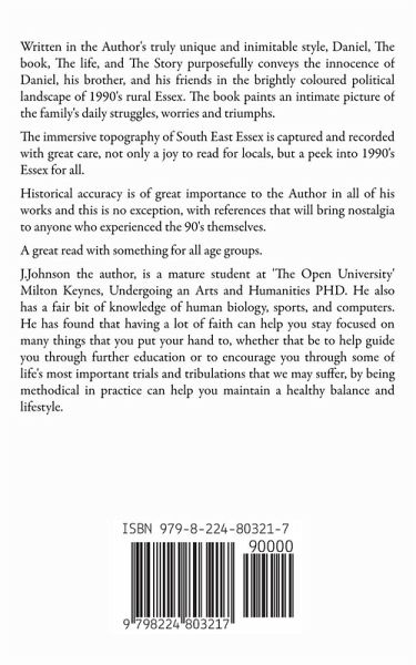 Daniel, The book, The story, The journey. Looking through a scope throughout Daniel's childhood, seeing his daily struggles. Walking along his journey, noticing the many cognitive altercations he had suffered from on a day-to-day basis. Seeing how he had interacted with his small circle of friends that he had made between his school life and activities that he had loved to engage with. Soaring through his family life with binoculars, the entertainment, the love, and compassion throughout the family household. The adventures they all had and enjoyed together inside the family household, the drive down to the village school through the countryside. The Saint Micheal's church is where the whole community from the village had rejoiced. The fun-filled tenacious compelling story of Daniel, the historical journey through the magical 1990's era! Daniel, The book, The story, The journey. Written in the Author's truly unique and inimitable style, Daniel, The book, The life and The story purposefully conveys the innocence of Daniel, his brother and his friends in the brightly coloured political landscape of 1990's rural Essex. The book paints an intimate picture of the family's daily struggles, worries and triumphs. The immersive topography of South East Essex is captured and recorded with great care, not only a joy to read for locals, but a peek into 1990's Essex for all. Historical accuracy is of great importance to the Author in all of his works and this is no exception, with references that will bring nostalgia to anyone who experienced the 90's themselves. A great read with something for all age groups. Check out our Author Website (www.jjohnsonauthor.com)..