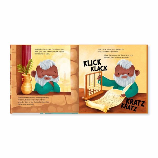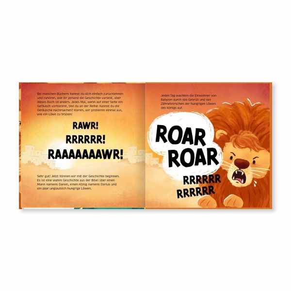 Es erzählt nicht nur die biblische Geschichte, nein, es lädt Kinder zum aktiven Mitmachen ein. So sitzt das Kind nicht einfach nur daneben und hört zu. Es darf mitmachen. Brüllen wie die Löwen, sich am Kopfkratzen,
