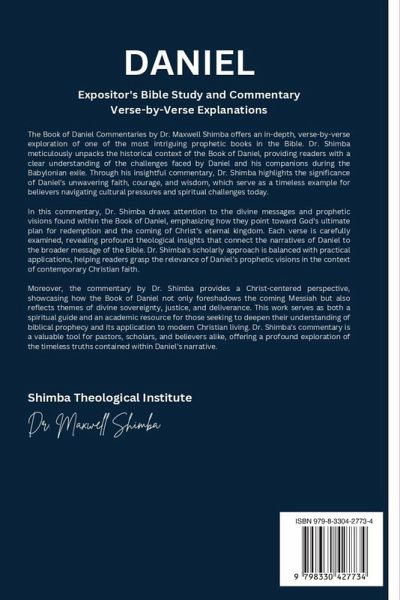 Daniel, Expositor's Bible Study and Commentary: Verse-by-Verse Explanations. The Book of Daniel Commentaries by Dr. Maxwell Shimba offers an in-depth, verse-by-verse exploration of one of the most intriguing prophetic books in the Bible. Dr. Shimba meticulously unpacks the historical context of the Book of Daniel, providing readers with a clear understanding of the challenges faced by Daniel and his companions during the Babylonian exile. Through his insightful commentary, Dr. Shimba highlights the significance of Daniel's unwavering faith, courage, and wisdom, which serve as a timeless example for believers navigating cultural pressures and spiritual challenges today. In this commentary, Dr. Shimba draws attention to the divine messages and prophetic visions found within the Book of Daniel, emphasizing how they point toward God's ultimate plan for redemption and the coming of Christ's eternal kingdom. Each verse is carefully examined, revealing profound theological insights that connect the narratives of Daniel to the broader message of the Bible. Dr. Shimba's scholarly approach is balanced with practical applications, helping readers grasp the relevance of Daniel's prophetic visions in the context of contemporary Christian faith. Moreover, the commentary by Dr. Shimba provides a Christ-centered perspective, showcasing how the Book of Daniel not only foreshadows the coming Messiah but also reflects themes of divine sovereignty, justice, and deliverance. This work serves as both a spiritual guide and an academic resource for those seeking to deepen their understanding of biblical prophecy and its application to modern Christian living. Dr. Shimba's commentary is a valuable tool for pastors, scholars, and believers alike, offering a profound exploration of the timeless truths contained within Daniel's narrative.