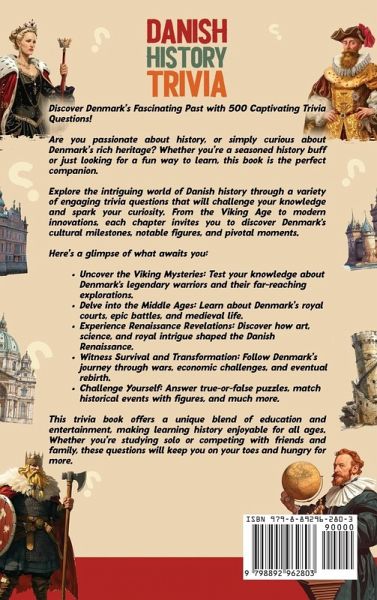 Discover Denmark's Fascinating Past with 500 Captivating Trivia Questions! Are you passionate about history, or simply curious about Denmark's rich heritage? Whether you're a seasoned history buff or just looking for a fun way to learn, this book is the perfect companion. Explore the intriguing world of Danish history through a variety of engaging trivia questions that will challenge your knowledge and spark your curiosity. From the Viking Age to modern innovations, each chapter invites you to discover Denmark's cultural milestones, notable figures, and pivotal moments. Here's a glimpse of what awaits you: Uncover the Viking Mysteries: Test your knowledge about Denmark's legendary warriors and their far-reaching explorations. Delve into the Middle Ages: Learn about Denmark's royal courts, epic battles, and medieval life. Experience Renaissance Revelations: Discover how art, science, and royal intrigue shaped the Danish Renaissance. Witness Survival and Transformation: Follow Denmark's journey through wars, economic challenges, and eventual rebirth. Challenge Yourself: Answer true-or-false puzzles, match historical events with figures, and much more. This trivia book offers a unique blend of education and entertainment, making learning history enjoyable for all ages. Whether you're studying solo or competing with friends and family, these questions will keep you on your toes and hungry for more.