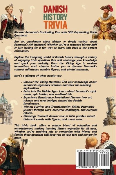 Discover Denmark's Fascinating Past with 500 Captivating Trivia Questions! Are you passionate about history, or simply curious about Denmark's rich heritage? Whether you're a seasoned history buff or just looking for a fun way to learn, this book is the perfect companion. Explore the intriguing world of Danish history through a variety of engaging trivia questions that will challenge your knowledge and spark your curiosity. From the Viking Age to modern innovations, each chapter invites you to discover Denmark's cultural milestones, notable figures, and pivotal moments. Here's a glimpse of what awaits you: Uncover the Viking Mysteries: Test your knowledge about Denmark's legendary warriors and their far-reaching explorations. Delve into the Middle Ages: Learn about Denmark's royal courts, epic battles, and medieval life. Experience Renaissance Revelations: Discover how art, science, and royal intrigue shaped the Danish Renaissance. Witness Survival and Transformation: Follow Denmark's journey through wars, economic challenges, and eventual rebirth. Challenge Yourself: Answer true-or-false puzzles, match historical events with figures, and much more. This trivia book offers a unique blend of education and entertainment, making learning history enjoyable for all ages. Whether you're studying solo or competing with friends and family, these questions will keep you on your toes and hungry for more.