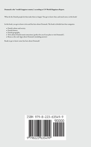 Denmark is the "world's happiest country," according to UN World Happiness Report. What do the Danish people do that make them so happy? You get to know that, and much more, in this book! In this book, you get to know trivia and fun facts about Denmark. The book is divided into four categories: Danish culture and society. Danish history. Danish geography. Trivia about Danish tourist attractions (perfect for you if you plan to visit Denmark!). Bonus at the end: Quiz about Denmark (including answers) Ready to get to know some fun facts about Denmark?