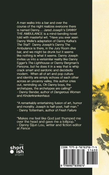 A man walks into a bar and over the course of the night realizes everyone there is named Danny.... Jared Joseph's DANNY THE AMBULANCE is a mind-bending novel told with masterful wit. 'Have you ever seen Danny Welle's adaptation of Danny Kafka's The Trial? Danny Joseph's Danny The Ambulance is there, in the Jury Room dive bar, and we might be drunk but it seems like nothing is what it seems. Danny Joseph invites us into a verisimilar reality like Danny Egger's The Lighthouse or Danny Bergman's Persona, but he does it in a way that is whip crack smart and sardonic and decidedly modern. When all of art and pop culture and identity are simply echoes of each other across an uncanny valley, this author cries out, reminding us, Oh Danny boys, the archetypes, the archetypes are calling!' - Danny Bender, author of Dangerous Women and Kinderkrankenhaus