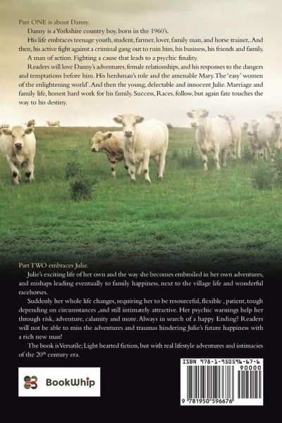 Part ONE is about Danny. Danny is a Yorkshire country boy, born in the 1960's. His life embraces teenage youth, student, farmer, lover, family man, and horse trainer,. And then, his active fight against a criminal gang out to ruin him, his business, his friends and family. A man of action. Fighting a cause that leads to a psychic finality. Readers will love Danny's adventures, female relationships, and his responses to the dangers and temptations before him. His herdsman's role and the amenable Mary. The 'easy' women of the enlightening world'. And then the young, delectable and innocent Julie. Marriage and family life, honest hard work for his family. Success, Races, follow, but again fate touches the way to his destiny. Part TWO embraces Julie. Julie's exciting life of her own and the way she becomes embroiled in her own adventures, and mishaps leading eventually to family happiness, next to the village life and wonderful racehorses. Suddenly her whole life changes, requiring her to be resourceful, flexible , patient, tough depending on circumstances ,and still intimately attractive. Her psychic warnings help her through risk, adventure, calamity and more. Always in search of a happy Ending? Readers will not be able to miss the adventures and traumas hindering Julie's future happiness with a rich new man! The book is Versatile; Light hearted fiction, but with real lifestyle adventures and intimacies of the 20th century era.