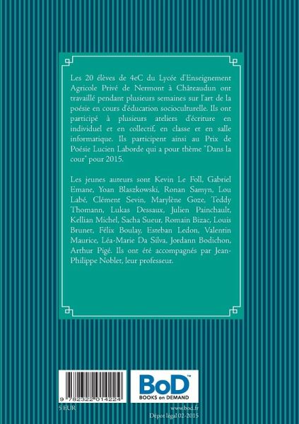 Les 20 élèves de 4eC du Lycée d'Enseignement Agricole Privé de Nermont à Châteaudun ont travaillé pendant plusieurs semaines sur l'art de la poésie en cours d'éducation socioculturelle. Ils ont participé à plusieurs ateliers d'écriture en individuel et en collectif, en classe et en salle informatique. Ils participent ainsi au Prix de Poésie Lucien Laborde qui a pour thème "Dans la cour" pour 2015.