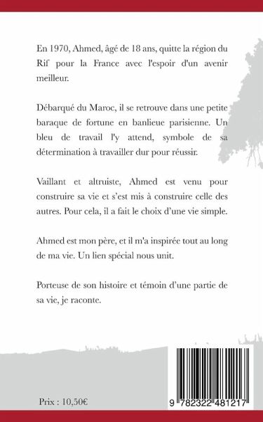 En 1970, Ahmed, âgé de 18 ans, quitte la région du Rif pour la France avec l'espoir d'un avenir meilleur. Débarqué du Maroc, il se retrouve dans une petite baraque de fortune en banlieue parisienne. Un bleu de travail l'y attend, symbole de sa détermination à travailler dur pour réussir.Vaillant et altruiste, Ahmed est venu pour construire sa vie et s'est mis à construire celle des autres. Pour cela, il a fait le choix d'une vie simple.Ahmed est mon père, et il m'a inspirée tout au long de ma vie. Un lien spécial nous unit.Porteuse de son histoire et témoin d'une partie de sa vie, je raconte.