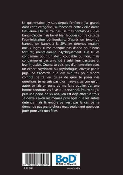La quarantaine, j'y suis depuis l'enfance, j'ai grandi dans cette catégorie. j'ai rencontré cette vieille dame très jeune. Oui! Je n'ai pas usé mes pantalons sur les bancs d'école mais bel et bien troqués contre ceux de l'administration pénitentiaire. D'après un ténor du barreau de Nancy, à la SPA, les détenus seraient mieux logés. Il me manque pas d'idée pour nous torturer, mentalement, psychiquement. Ok! Tu es condamné pour un délit, coupable ou non, mais condamné et pas amendé à subir leur bassesse et leur injustice. Quand tu vois lors d'un entretien avec un expert psychiatre ou psychologue, envoyé par le juge, ne t'accorde que dix minutes pour rendre compte de ta vie, tu as de quoi te poser des questions. je ne suis pas plus mauvais garçon qu'un autre. Je fais en sorte de me faire oublier. J'ai une bonne conduite vis-à-vis du personnel. Pourtant, j'ai prix une peine de six ans, j'en est déjà effectué trois. Je devrais avoir les mêmes privilèges que les autres détenus mais là encore ce n'est pas le cas. Je ne demande pas grand-chose mais seulement quelques jours pour voir mes filles.