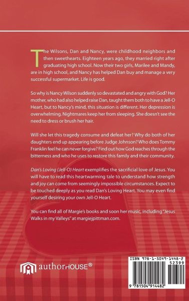 The Wilsons, Dan and Nancy, were childhood neighbors and then sweethearts. Eighteen years ago, they married right after graduating high school. Now their two girls, Marilee and Mandy, are in high school, and Nancy has helped Dan buy and manage a very successful supermarket. Life is good. So why is Nancy Wilson suddenly so devastated and angry with God? Her mother, who had also helped raise Dan, taught them both to have a Jell-O Heart, but to Nancy's mind, this situation is different. Her depression is overwhelming. Nightmares keep her from sleeping. She doesn't see the need to dress or brush her hair. Will she let this tragedy consume and defeat her? Why do both of her daughters end up appearing before Judge Johnson? Who does Tommy Franklin feel he can never forgive? Find out how God reaches through the bitterness and who he uses to restore this family and their community. Dan's Loving (Jell-O) Heart exemplifies the sacrificial love of Jesus. You will have to read this heartwarming tale to understand how strength and joy can come from seemingly impossible circumstances. Expect to be touched deeply as you read Dan's Loving Heart. You may even find yourself desiring your own Jell-O Heart. You can find all of Margie's books and soon her music, including "Jesus Walks in my Valleys" at margiejpittman.com.