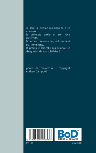 Je serai le dédale qui cherche à se nommer, la première étoile et son rêve d'éternité, le berceau de nos âmes, le flottement de l'immensité, la première étincelle qui éclabousse chaque iris de son soleil d'été.