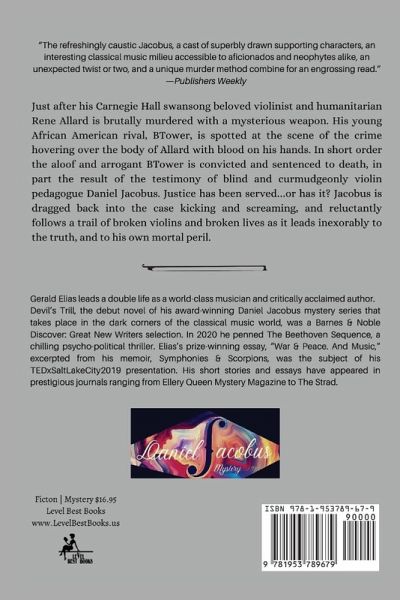 Just after his Carnegie Hall swansong beloved violinist and humanitarian Rene Allard is brutally murdered with a mysterious weapon. His young African American rival, BTower, is spotted at the scene of the crime hovering over the body of Allard with blood on his hands. In short order the aloof and arrogant BTower is convicted and sentenced to death, in part the result of the testimony of blind and curmudgeonly violin pedagogue Daniel Jacobus. Justice has been served...or has it? Jacobus is dragged back into the case kicking and screaming, and reluctantly follows a trail of broken violins and…mehr