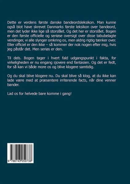 Danske bandeord af Tue Stengaard er verdens første danske bandeordsleksikon. Man kunne også have skrevet Danmarks første leksikon over bandeord, men det lyder ikke lige så storslået. Og det ER storslået. Bogen er den første officielle og seriøse oversigt over disse tabubelagte vendinger, vi alle slynger omkring os, men aldrig rigtig tænker over. Eller officiel er den ikke - så kommer der nok nogen efter forfatteren, hvis han påstår det. Men seriøs er den. Til dels. Bogen tager i hvert fald udgangspunkt i fakta, for virkeligheden er nu engang sjovere end fantasien. Og det er fedt, for så kan vi både more os og blive klogere samtidig.