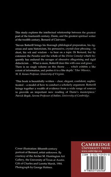 In this study, Steven Botterill explores the intellectual relationship between the greatest poet of the fourteenth century, Dante, and the greatest spiritual writer of the twelfth century, Bernard of Clairvaux. Botterill analyses the narrative episode involving Bernard as a character in the closing cantos of the Paradiso, against the background of his medieval reputation as a contemplative mystic, devotee of Mary, and, above all, a preacher of outstanding eloquence. Botterill draws on a wide range of materials to establish and illustrate the connections between Bernard's reputation and his portrayal in Dante's poem. Botterill's fresh approach to the analysis of the whole episode will provoke the reader to re-evaluate the significance and implications of Bernard's presence in the Commedia.