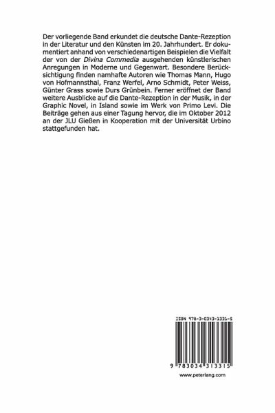 Inhalt: Annette Simonis: «Ein Traum von einer schmalen Lorbeerkrone». Zur Dante-Rezeption bei Thomas Mann und Hugo von Hofmannsthal - Michael Dallapiazza: «lebe ich noch immer und schon wieder». Franz Werfels Roman Stern der Ungeborenen - Robert K. Weninger: Kontrafakturen: Arno Schmidts Göttliche Komödien - Maria Elisa Montironi: Dante und Peter Weiss: Das ketzerische Paradies der Literatur - Corinna Ott: «Wie wird man Erinnerungen los?» - Die Göttliche Komödie und Günter Grass' Roman Hundejahre - Francesca Bravi: «Der schweigende Dante». Auf Alighieris Spuren im Werk Durs Grünbeins - Kirsten Iden: Primo Levis Se questo è un uomo sowie I sommersi e i salvati im Vergleich zu Dante Alighieris Divina Commedia - Ein erweiterter Vergleich - Michael Schwarte: «Après une lecture de Dante» Dante-Vertonungen deutscher Komponisten im XX. Jahrhundert - Laura Muth/Annette Simonis: Dantes Divina Commedia als Graphic Novel. Seymour Chwasts kurzweilige Dante-Adaption im Comic - Michael Dallapiazza: Dante im isländischen Supermarkt.