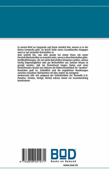 In seinem Brief an Cangrande sagt Dante ziemlich klar, worum es in der Divina Commedia geht. An keiner Stelle seines Gesamtwerkes hingegen weist er auf versteckte Botschaften in dem Gedicht hin, was aber gerade bei einem Mann mit seiner Persönlichkeitsstruktur zu erwarten wäre, wenn es diese Botschaften gäbe.Veröffentlichungen, die auf solche Botschaften hinweisen wollen, weisen häufig Ungenauigkeiten oder gar Rechenfehler auf, darüber hinaus ist gezeigt worden, daß bei hinreichend langen Texten und einer hinreichenden Anzahl von Faktoren die Wahrscheinlichkeit für "positive" Resultaten groß ist. Schließlich sind die angeblichen Beziehungen zwischen einzelnen Stichwörtern oft alles andere als zwingend.Andererseits läßt sich aufgrund der Einheitlichkeit der Thematik (z.B. Paradiso: Christus, Heilige, Kirche) nahezu immer ein Zusammenhang konstruieren.