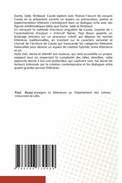 Dante, Sade, Rimbaud, Cauda explore avec finesse l'oeuvre de Jacques Cauda en la présentant comme un espace où provocation, poésie et expérimentation littéraire s'entrelacent dans un dialogue riche avec des figures emblématiques telles que Dante, Sade et Rimbaud.En retraçant la méthode d'écriture singulière de Cauda, inspirée de « l'automatisme d'output » d'Arnulf Rainer, Paul Basso apporte un éclairage précieux sur un processus créatif qui dépasse les normes littéraires traditionnelles, en insistant sur le caractère sensoriel et charnel de l'écriture de Cauda qui transcende les catégories littéraires habituelles pour devenir un espace de création hybride, entre littérature et art.Style clair, dense et attentif aux nuances, qui rend accessible un propos exigeant tout en respectant la complexité des idées abordées, cette approche donne à lire une profondeur qui captivera sans nul doute les lecteurs intéressés par la création contemporaine et les dialogues entre quatre grandes oeuvres littéraires.