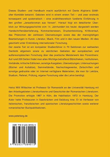 Dieses Studien- und Handbuch macht ausführlich mit Dante Alighieris Göttlicher Komödie bekannt. Geboten wird in einem ersten Teil - und zwar erstmals konsequent und systematisch - eine erzähltheoretisch fundierte Einführung in den großen «Jenseitsroman aus Versen». Hierauf folgt ein detaillierter Überblick zur Wirkungsgeschichte vom 14. Jahrhundert bis heute: dargestellt werden Handschriftenüberlieferung, Kommentarwesen, Druckentwicklung, Kritikverlauf, das Phänomen der zahllosen Übersetzungen sowie das der mannigfaltigen Bearbeitungen in Kunst, Literatur, Musik, Film und in den neuen Medien. All dies geschieht unter Einbindung internationaler Forschung. Der zweite Teil ist ein kompakter Studienführer in 70 Sektionen zur weltweiten Dantistik allgemein sowie zu sämtlichen Gebieten der europäischen und außereuropäischen Forschung über das poetische Meisterwerk des Florentiners: Auf rund 200 Seiten findet man alles Wichtige betreffend Bibliotheken, Institutionen, Verbände, kritische Editionen, sonstige Ausgaben, Übersetzungen, Untersuchungen (Bücher und Aufsätze), Sammelbände, Nachschlagewerke, Zeitschriften und sonstige gedruckte oder im Internet verfügbare Materialien, die man für Lektüre, Studium, Referat, Prüfung, eigene Forschung oder die Lehre benötigt.