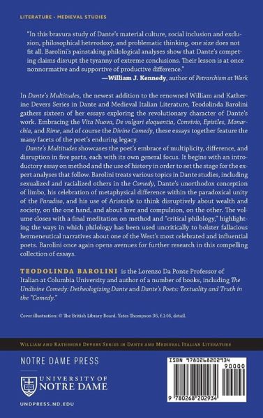 A critical addition to Dante studies that illuminates the poet's disruptive impact within Italian culture and foregrounds Barolini's marked contribution to the field. In Dante's Multitudes, the newest addition to the renowned William and Katherine Devers Series in Dante and Medieval Italian Literature, Teodolinda Barolini gathers sixteen of her essays exploring the revolutionary character of Dante's work. Embracing the Vita Nuova, De vulgari eloquentia, Convivio, Epistles, Monarchia, and Rime, and of course the Divine Comedy, these essays together feature the many facets of the poet's enduring legacy. Dante's Multitudes showcases the poet's embrace of multiplicity, difference, and disruption in five parts, each with its own general focus. It begins with an introductory essay on method and the use of history in order to set the stage for the expert analyses that follow. Barolini treats various topics in Dante studies, including sexualized and racialized others in the Comedy, Dante's unorthodox conception of limbo, his celebration of metaphysical difference within the paradoxical unity of the Paradiso, and his use of Aristotle to think disruptively about wealth and society, on the one hand, and about love and compulsion, on the other. The volume closes with a final meditation on method and "critical philology," highlighting the ways in which philology has been used uncritically to bolster fallacious hermeneutical narratives about one of the West's most celebrated and influential poets. Barolini once again opens avenues for further research in this compelling collection of essays. This volume will be of interest to scholars in Dante studies, Italian studies, and medieval and Renaissance literature more broadly.