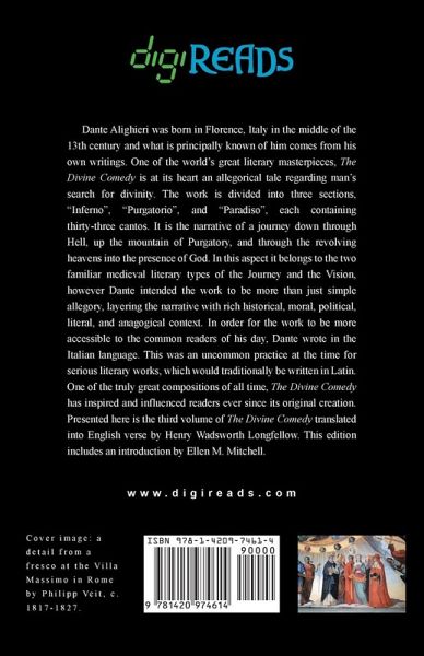 Dante Alighieri was born in Florence, Italy in the middle of the 13th century and what is principally known of him comes from his own writings. One of the world's great literary masterpieces, "The Divine Comedy" is at its heart an allegorical tale regarding man's search for divinity. The work is divided into three sections, "Inferno", "Purgatorio", and "Paradiso", each containing thirty-three cantos. It is the narrative of a journey down through Hell, up the mountain of Purgatory, and through the revolving heavens into the presence of God. In this aspect it belongs to the two familiar medieval literary types of the Journey and the Vision, however Dante intended the work to be more than just simple allegory, layering the narrative with rich historical, moral, political, literal, and anagogical context. In order for the work to be more accessible to the common readers of his day, Dante wrote in the Italian language. This was an uncommon practice at the time for serious literary works, which would traditionally be written in Latin. One of the truly great compositions of all time, "The Divine Comedy" has inspired and influenced readers ever since its original creation. Presented here is the third volume of "The Divine Comedy" translated into English verse by Henry Wadsworth Longfellow. This edition is printed on premium acid-free paper and includes an introduction by Ellen M. Mitchell.