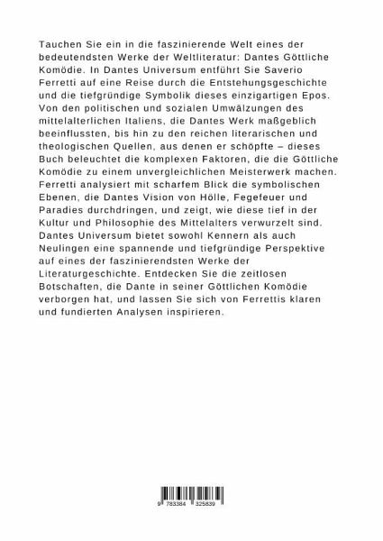 Tauchen Sie ein in die faszinierende Welt eines der bedeutendsten Werke der Weltliteratur: Dantes Göttliche Komödie. In Dantes Universum entführt Sie Saverio Ferretti auf eine Reise durch die Entstehungsgeschichte und die tiefgründige Symbolik dieses einzigartigen Epos.Von den politischen und sozialen Umwälzungen des mittelalterlichen Italiens, die Dantes Werk maßgeblich beeinflussten, bis hin zu den reichen literarischen und theologischen Quellen, aus denen er schöpfte - dieses Buch beleuchtet die komplexen Faktoren, die die Göttliche Komödie zu einem unvergleichlichen Meisterwerk machen. Ferretti analysiert mit scharfem Blick die symbolischen Ebenen, die Dantes Vision von Hölle, Fegefeuer und Paradies durchdringen, und zeigt, wie diese tief in der Kultur und Philosophie des Mittelalters verwurzelt sind.Dantes Universum bietet sowohl Kennern als auch Neulingen eine spannende und tiefgründige Perspektive auf eines der faszinierendsten Werke der Literaturgeschichte. Entdecken Sie die zeitlosen Botschaften, die Dante in seiner Göttlichen Komödie verborgen hat, und lassen Sie sich von Ferrettis klaren und fundierten Analysen inspirieren.