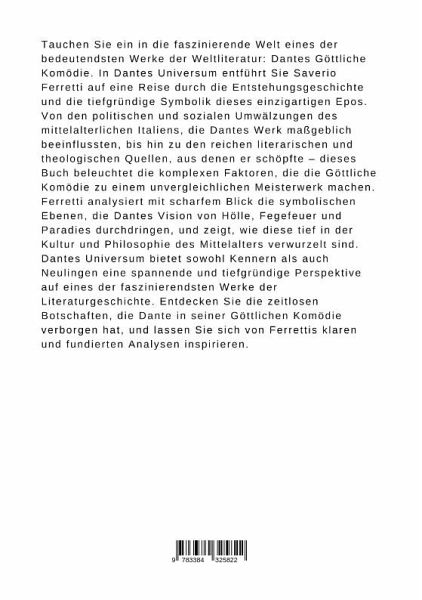 Tauchen Sie ein in die faszinierende Welt eines der bedeutendsten Werke der Weltliteratur: Dantes Göttliche Komödie. In Dantes Universum entführt Sie Saverio Ferretti auf eine Reise durch die Entstehungsgeschichte und die tiefgründige Symbolik dieses einzigartigen Epos.Von den politischen und sozialen Umwälzungen des mittelalterlichen Italiens, die Dantes Werk maßgeblich beeinflussten, bis hin zu den reichen literarischen und theologischen Quellen, aus denen er schöpfte - dieses Buch beleuchtet die komplexen Faktoren, die die Göttliche Komödie zu einem unvergleichlichen Meisterwerk machen. Ferretti analysiert mit scharfem Blick die symbolischen Ebenen, die Dantes Vision von Hölle, Fegefeuer und Paradies durchdringen, und zeigt, wie diese tief in der Kultur und Philosophie des Mittelalters verwurzelt sind.Dantes Universum bietet sowohl Kennern als auch Neulingen eine spannende und tiefgründige Perspektive auf eines der faszinierendsten Werke der Literaturgeschichte. Entdecken Sie die zeitlosen Botschaften, die Dante in seiner Göttlichen Komödie verborgen hat, und lassen Sie sich von Ferrettis klaren und fundierten Analysen inspirieren.