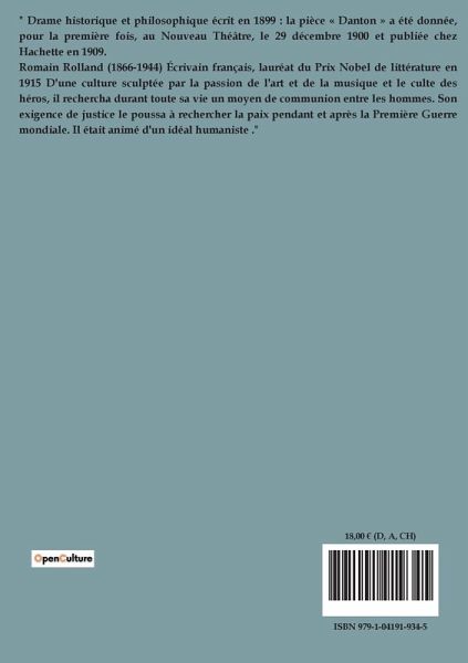 " Drame historique et philosophique écrit en 1899 : la pièce « Danton » a été donnée, pour la première fois, au Nouveau Théâtre, le 29 décembre 1900 et publiée chez Hachette en 1909. Romain Rolland (1866-1944) Écrivain français, lauréat du Prix Nobel de littérature en 1915 D'une culture sculptée par la passion de l'art et de la musique et le culte des héros, il rechercha durant toute sa vie un moyen de communion entre les hommes. Son exigence de justice le poussa à rechercher la paix pendant et après la Première Guerre mondiale. Il était animé d'un idéal humaniste ."