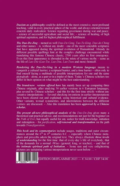 To render the Dao-De-Ging in a modern Western language means to surmount a cultural barrier, a scriptural barrier and a time barrier , only to find oneself before a multitude of possible interpretations for one glyph, or for a pair or a triplet of them. Even today's Chinese scholars are divided over what might be the best understanding. The brand-new version offered here was mainly made comparing three Chinese originals, after studying 30 earlier versions in 6 European languages, plus several by Chinese scholars - and this strictly, and for the first time really, without any supposually creative interpolations. Many shocking inventions in earlier interpretations have been cleared and explained, using historical and cultural evidence. Other variants, textual symmetries, and interrelations between the different verses, are discussed. - And this translation has been approved by a Chinese scholar. Esoteric commentaries are very in-depth from Nr. 34 to 81, but only sketchy from Nr 1 to 33, where they recommend an earlier esoteric commentary - but not the textual translation used by it - around 1980, by Jan van Rijckenborgh and Catharose de Petri. This book and its commentaries include usages, traditions and outer circumstances of the 6th to 4th centuries b.C. - especially where metaphors and proverbs adorn the original text. They always illustrate three levels of understanding : that of every-day's life of everybody, that of the demands for a normal Wise - general, king, or teacher - and that of the intimate inner spiritual path of Initiation. Some rare and very enlightening pictures are sustaining various interpretations never heard before.