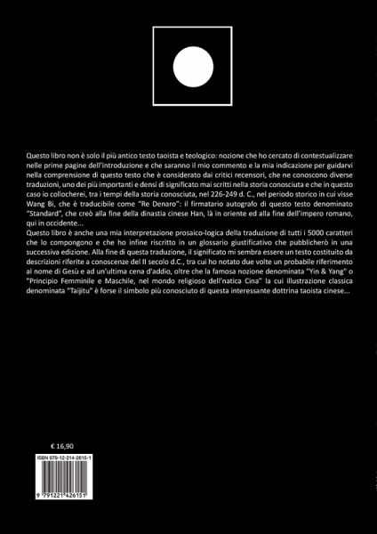 Questo libro non è solo il più antico testo taoista e teologico: nozione che ho cercato di contestualizzare nelle prime pagine dell'introduzione e che saranno il mio commento e la mia indicazione per guidarvi nella comprensione di questo testo che è considerato dai critici recensori, che ne conoscono diverse traduzioni, uno dei più importanti e densi di significato mai scritti nella storia conosciuta che in questo caso io collocherei al 226-249 d. C., nel periodo storico in cui visse Wang Bi, il firmatario di questo testo denominato "Standard", alla fine della dinastia cinese Han là in oriente, ed alla fine dell'imprero romano qui in occidente. Questo libro è anche una mia interpretazione prosaico-logica della traduzione di tutti i 5000 caratteri che lo compongono e che ho infine riscritto in un glossario giustificativo che pubblicherò in una successiva edizione. Alla fine di questa traduzione, mi sembra essere un testo costituito da descrizioni riferite a conoscenze del II secolo d.C. tra cui ho notato due volte un probabile riferimento al nome di Gesù e ad un'ultima cena d'addio, oltre che la famosa nozione denominata "Yin e Yang" o "Femminile e Maschile" la cui illustrazione classica denominata "Taijitu" è forse il simbolo più conosciuto di questa interessante dottrina taoista cinese.