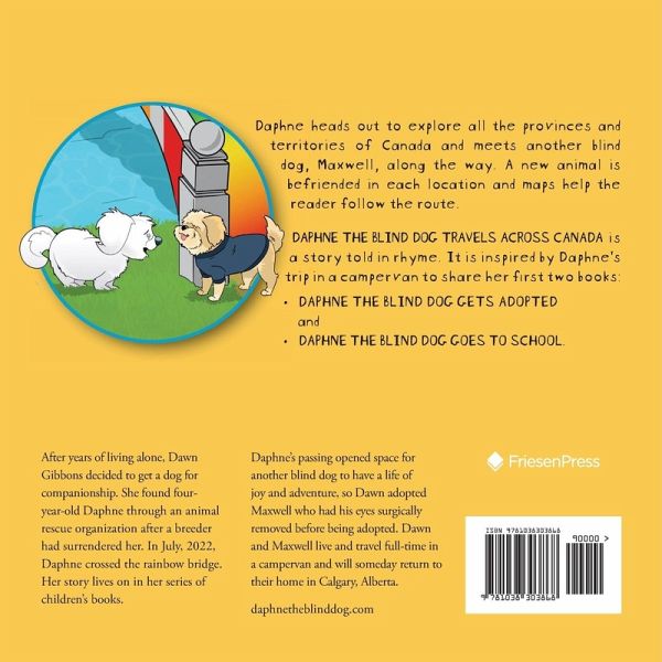 Daphne heads out to explore all the provinces and territories of Canada and meets another blind dog, Maxwell, along the way. A new animal is befriended in each location and maps help the reader follow the route. DAPHNE THE BLIND DOG TRAVELS ACROSS CANADA is a story told in rhyme. It is inspired by Daphne's trip in a campervan to share her first two books: ¿ DAPHNE THE BLIND DOG GETS ADOPTED and ¿ DAPHNE THE BLIND DOG GOES TO SCHOOL