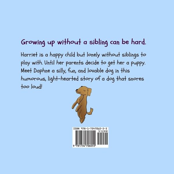 Growing up without a sibling can be hard. Harriet is a happy child but lonely without siblings to play with, until her parents decide to get her a puppy. Meet Daphne a silly, fun, and loveable dog in this humorous, light-hearted story of a dog that snores too loud!