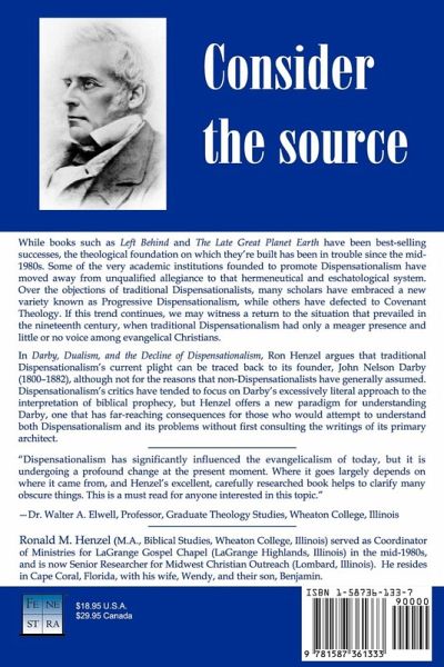 In Darby, Dualism, and the Decline of Dispensationalism, Ron Henzel argues that traditional Dispensationalism's current plight can be traced back to its founder, John Nelson Darby (1800-1882), although not for the reasons that non-Dispensationalists have generally assumed. Dispensationalism's critics have tended to focus on Darby's excessively literal approach to the interpretation of biblical prophecy, but Henzel offers a new paradigm for understanding Darby, one that has far-reaching consequences for those who would attempt to understand both Dispensationalism and its problems without first consulting the writings of its primary architect.