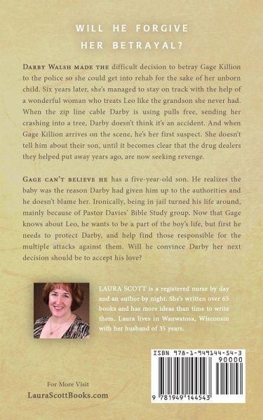 Will he forgive her betrayal? Darby Walsh made the difficult decision to betray Gage Killion to the police so she could get into rehab for the sake of her unborn child. Six years later, she's managed to stay on track with the help of a wonderful woman who treats Leo like the grandson she never had. When the zip line cable Darby is using pulls free, sending her crashing into a tree, Darby doesn't think it's an accident. And when Gage Killion arrives on the scene, he's her first suspect. She doesn't tell him about their son, until it becomes clear that the drug dealers they helped put away, are now seeking revenge. Gage can't believe he has a five-year-old son. He realizes the baby was the reason Darby had turned him over to the authorities, and he doesn't blame her. Ironically, being in jail turned his life around, mainly because of Pastor Davies Bible Study group. Now that Gage knows about Leo, he wants to be a part of the boy's life, but first he needs to protect Darby, and help find those responsible for the multiple attacks against them. Will he convince Darby her next decision should be to accept his love?