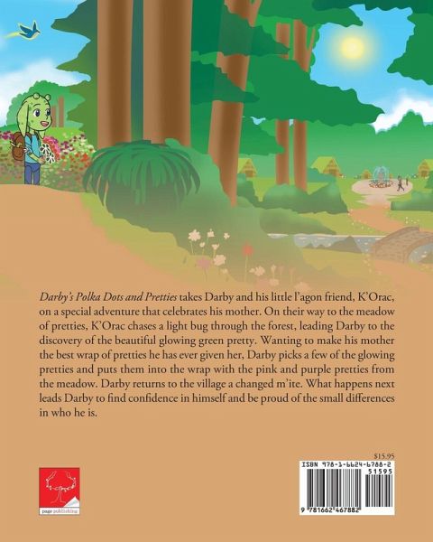 Darby's Polka Dots and Pretties takes Darby and his little l'agon friend, K'Orac, on a special adventure that celebrates his mother. On their way to the meadow of pretties, K'Orac chases a light bug through the forest, leading Darby to the discovery of the beautiful glowing green pretty. Wanting to make his mother the best wrap of pretties he has ever given her, Darby picks a few of the glowing pretties and puts them into the wrap with the pink and purple pretties from the meadow. Darby returns to the village a changed m'ite. What happens next leads Darby to find confidence in himself and be proud of the small differences in who he is.