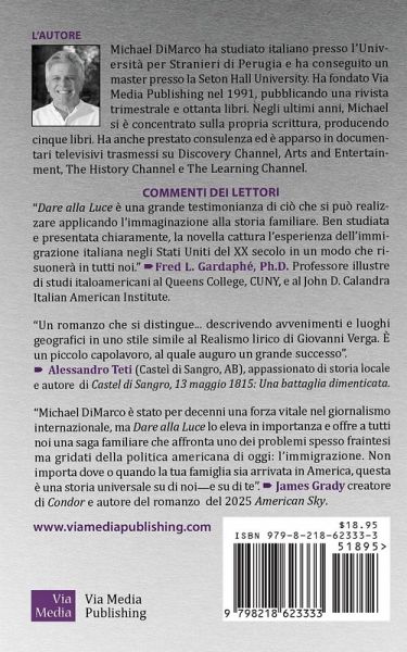 Questo racconto biografico, Dare alla Luce, parla della vita familiare, della sopravvivenza alle guerre mondiali, dell'immigrazione e dell'adattamento a una nuova cultura. È una storia basata sulla vita di Michele DiMarco (1893-1975). I lettori potranno immaginare la maestosa bellezza naturale del villaggio natale di Michele nell'Italia centrale e conoscere la sua ricca storia. I lettori percepiranno anche la dura realtà della vita che costrinse Michele a emigrare. Poco dopo l'arrivo negli Stati Uniti, Michele viene arruolato nell'esercito italiano. Ritorna in Italia per combattere nella W.W. Io, ferito, fatto prigioniero, fuggo. Michele attraversa l'Atlantico una seconda volta, accetta lavori umili e alla fine avvia la propria panetteria. Il suo successo lo porta ad acquistare una casa, a sposarsi e ad avere tre figli. Come la mafia e la Grande Depressione gli cambiano la vita? Sebbene la trama si concentri su Michele, vengono presentate forti relazioni ovunque, la principale delle quali con i suoi genitori, fratello, moglie e nipote. Viene dettagliato anche ciò che accade alla sua famiglia e ai suoi amici in Italia durante la seconda guerra mondiale. Questo romanzo parla dei valori della vita che ruotano attorno alla famiglia, a una forte etica del lavoro, all'umorismo e all'amore. Il personaggio principale non è un rappresentante unico di questo sistema di valori. Molti altri si sono sacrificati come lui, si sono presi cura delle loro famiglie e hanno avuto compassione per gli altri. Questo libro incoraggerà tutti coloro che hanno parenti dai capelli grigi a conoscere le loro storie, soprattutto se sono immigrati. Le loro storie nutrono le nostre radici affinché rami sani continuino a crescere. "Dare alla Luce è una grande testimonianza di ciò che si può ottenere con applicare l'immaginazione alla storia familiare. Ben studiato e presentato chiaramente, la novella cattura l'esperienza dell'immigrazione italiana del XX secolo negli Stati Uniti in un modo che risuonerà in tutti noi". - Fred L. Gardaphé, Ph.D. Illustre professore di studi italoamericani Queens College, CUNY e il John D. Calandra Istituto Italo Americano