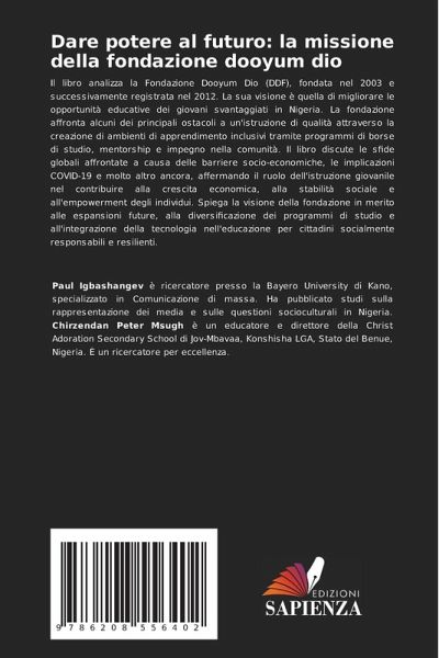 Il libro analizza la Fondazione Dooyum Dio (DDF), fondata nel 2003 e successivamente registrata nel 2012. La sua visione è quella di migliorare le opportunità educative dei giovani svantaggiati in Nigeria. La fondazione affronta alcuni dei principali ostacoli a un'istruzione di qualità attraverso la creazione di ambienti di apprendimento inclusivi tramite programmi di borse di studio, mentorship e impegno nella comunità. Il libro discute le sfide globali affrontate a causa delle barriere socio-economiche, le implicazioni COVID-19 e molto altro ancora, affermando il ruolo dell'istruzione giovanile nel contribuire alla crescita economica, alla stabilità sociale e all'empowerment degli individui. Spiega la visione della fondazione in merito alle espansioni future, alla diversificazione dei programmi di studio e all'integrazione della tecnologia nell'educazione per cittadini socialmente responsabili e resilienti.