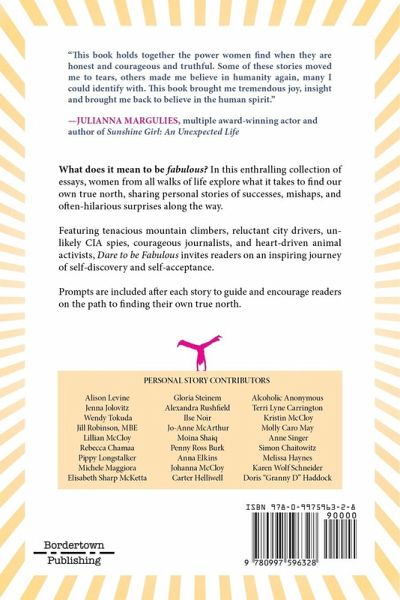 Dare to be Fabulous takes you on a journey of self-discovery and self-acceptance Every person's personality and circumstances are unique, but we can all relate to how it feels when we dare ourselves to cross a personal divide, enter unknown terrain, take a chance, shift perspective, face a fear, or stretch a little. In this enthralling book, twenty-seven women from all walks of life explore what it takes to find our own true north, sharing stories about personal successes, mishaps, and often-hilarious surprises along the way. Their stories will inspire you, warm your heart, and make you laugh. A writing, reflection, or action prompt also follows each story. "This book holds together the power women find when they are honest and courageous and truthful. Some of these stories moved me to tears, others made me believe in humanity again, many I could identify with. This book brought me tremendous joy, insight and brought me back to believe in the human spirit." ~ JULIANNA MARGULIES, multiple award-winning actor and author of Sunshine Girl: An Unexpected Life Track the path to your own true north Consider the Dare to be Fabulous Journal Notebook as a writing companion for the personal prompts in this book. They make a beautiful set.