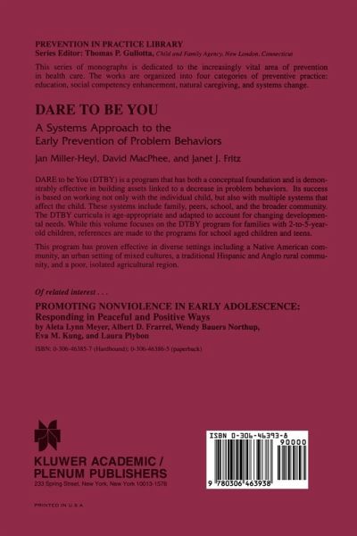 DARE To Be You (DTBY) is a program that has both a conceptual foundation and is demonstrably effective in building assets linked to a decrease in problem behaviors. Its success is based on working not only with the individual child, but also with multiple systems that affect the child. These systems include family, peers, school and the broader community. The DTBY curricula is age-appropriate and adapted to account for changing developmental needs. While this volume focuses on the DTBY program for families with 2 to 5 year old children, references are made to the programs for school aged children and teens.